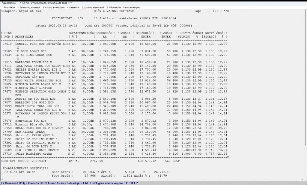 Cikkelemesen, gyártónként, szállítónként, ITJ/VTSZ-nként vagy statisztikai csoportosítás szerint kérhetünk információt a beszerzésről, értékesítésről és egyéb mozgásokról, kiegészítve a nettó árrés, árrés százalék, forgási sebesség, átlagkészlet információkkal